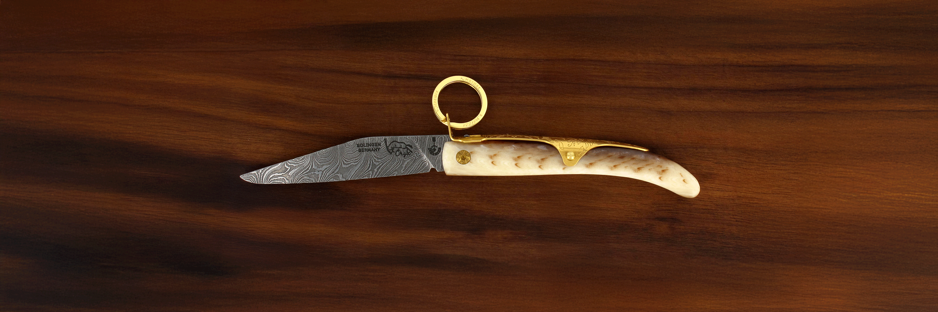 Der elegante Bügel und Griffbeschlag sind aufwendig mit 24-Karat Gold veredelt. Dieser feine Goldüberzug setzt spektakuläre Akzente, die das Messer zum stilvollen Blickfang machen. -