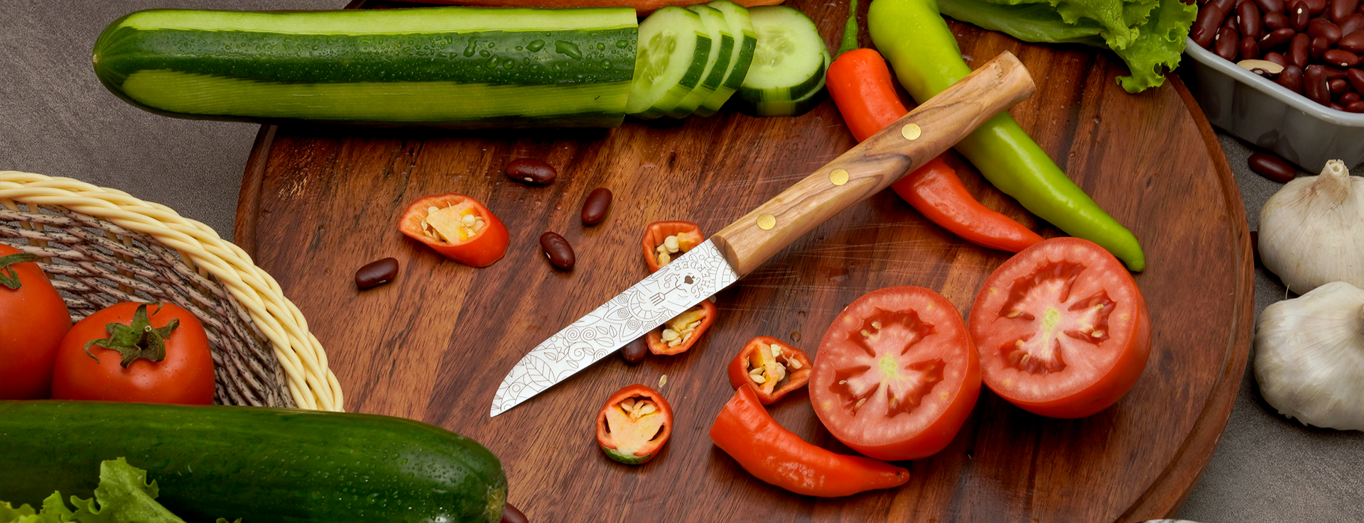 Der ergonomische Griff aus edlen Hölzern wie Walnuss, Olive, Kirsche oder Padouk wird in unserer hauseigenen Schreinerei gefertigt. Durch den nahtlosen Übergang zwischen Klinge und Griff wird Schmutzansammlung verhindert und die Reinigung erleichtert. Zusätzlich kannst du dein Messer mit dekorativen Lasergravuren in verschiedenen Designs – von Ranken über Blumen bis Mosaik – personalisieren.